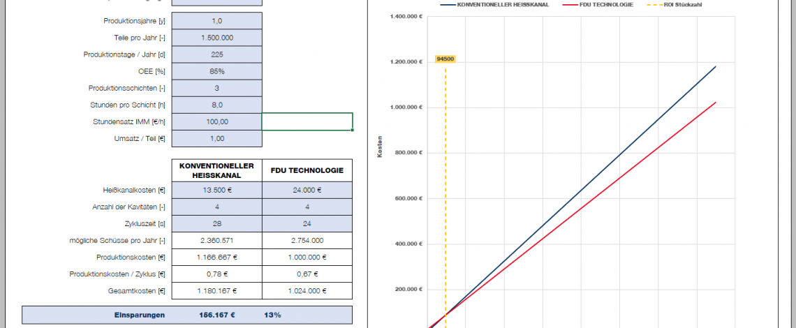 Um die Entscheidungsfindung für den Einsatz der FDU Technologie zu erleichtern, bietet die FDU Hotrunner GmbH den ROI Cost Calculator an. Durch die Eingabe von relevanten Zahlen und Daten erhalten Kunden sofort einen Überblick über die Einsparungen sowie die Amortisationszeit nach Stückzahl und Tagen. Diese benutzerfreundliche Funktion ermöglicht es Unternehmen, schnell und effizient die Wirtschaftlichkeit der FDU Technologie zu beurteilen.